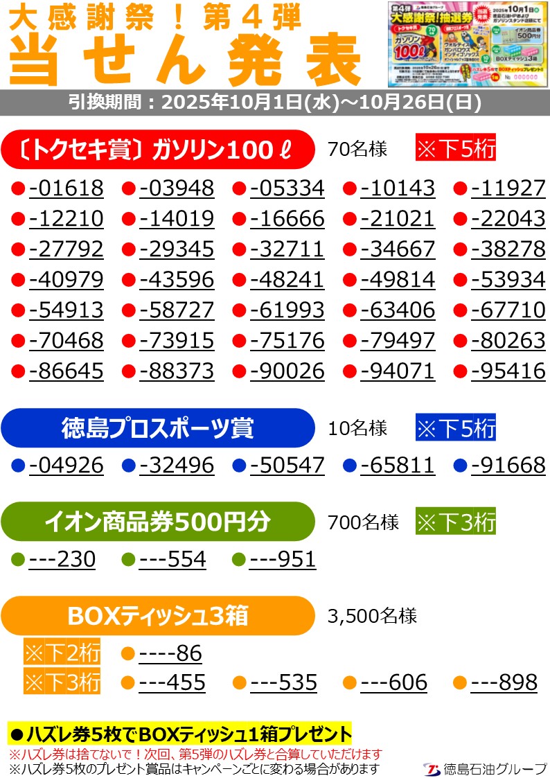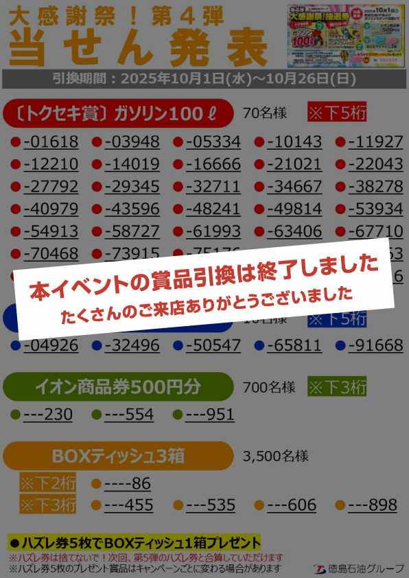 徳島石油グループ 大感謝祭!第4弾 当選番号発表!!