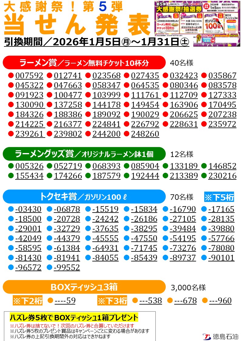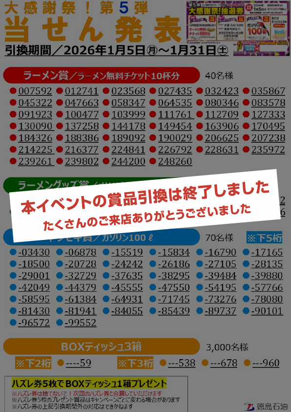 徳島石油グループ 大感謝祭!第5弾 当選番号発表!!